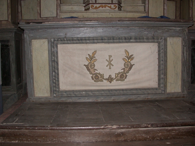 Ensemble de l'autel de la Vierge : autel, tabernacle, retable, 3 gradins d'autel, 2 degrés d'autel,