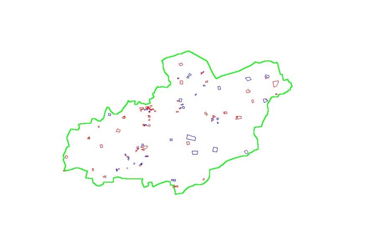 Carte représentant les maisons simplement recensées en bleu et les documentées en rougeImmatriculation