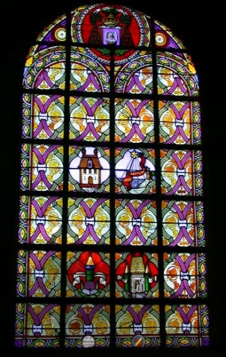 Ensemble de 6 verrières géométriques figurées du choeur et du transept : Litanies de la Vierge et Symboles de l'Eglise, et des verrières à personnages de la nef : Saint Pierre, Saint Joseph et l'Enfant, Notre-Dame de Lourdes et de Pontmain, Sacré Cœur,