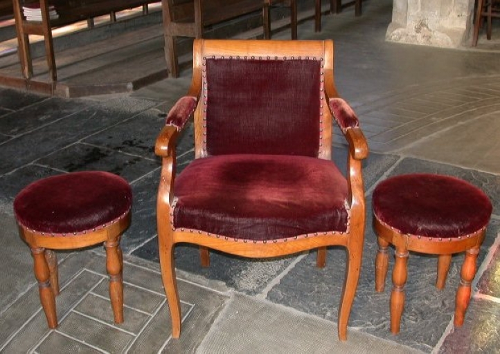 Ensemble d'un fauteuil de célébrant et de 2 tabourets d'église,
