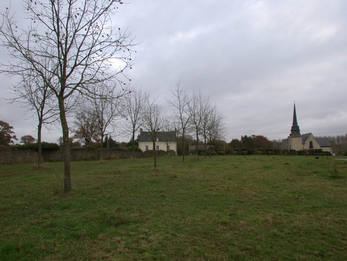 Vue prise du manoir de la Motte de Drouges, enceinte, école et église paroissialeImmatriculation