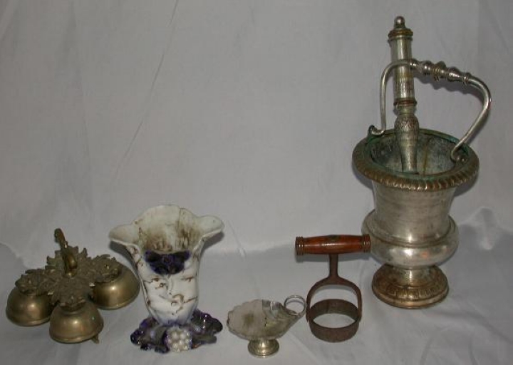 Sonnette liturgique, vase à fleurs, coquille de baptême, découpe-hostie, seau à eau béniteImmatriculation