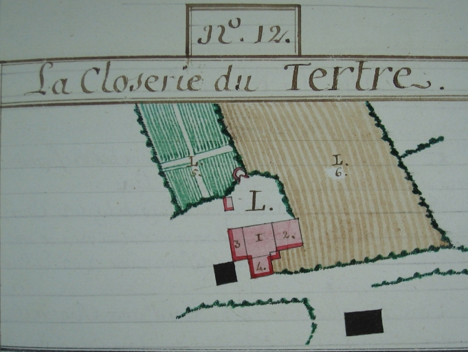 Plan de 1785 : au sud, le jardin à légumes en vert, le jardin à chanvre en jauneImmatriculation