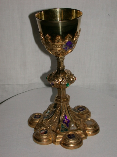 Chapelle d'orfèvrerie dans sa boîte : calice, patène, 2 burettes et leur plateau, clochette,