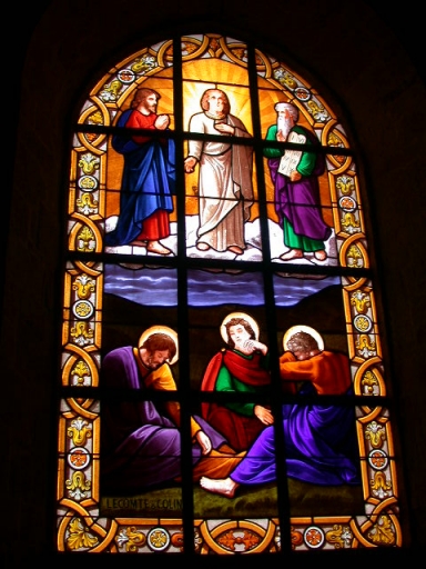 Ensemble des 9 verrières à personnages des baies 1, 3, 4, 6 à 8, 10, 12, 00 : ND de Lourdes, Communion de saint Jérome, Résurrection de Lazare, Christ au mont des Oliviers, Christ préchant, Laissez venir à moi les petits enfants, Jésus et la Samaritaine,