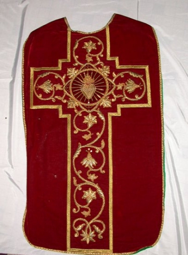 Ornement rouge 1 : chasuble, bourse de corporal, étole, manipule, pale, voile de calice,