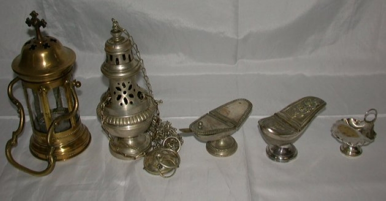 Lanterne du viatique, Encensoir, Navettes à encens 1 et 2, Coquille de baptêmeImmatriculation