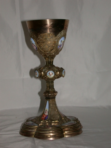 Chapelle d'orfèvrerie dans sa boîte : calice, patène, 2 burettes et leur plateau, clochette,