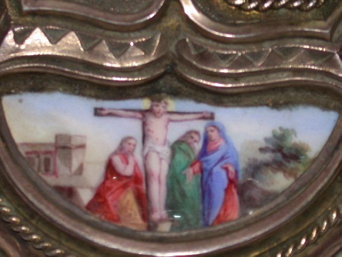 Chapelle d'orfèvrerie dans sa boîte : calice, patène, 2 burettes et leur plateau, clochette,