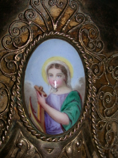 Chapelle d'orfèvrerie dans sa boîte : calice, patène, 2 burettes et leur plateau, clochette,