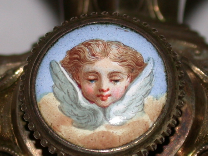 Chapelle d'orfèvrerie dans sa boîte : calice, patène, 2 burettes et leur plateau, clochette,