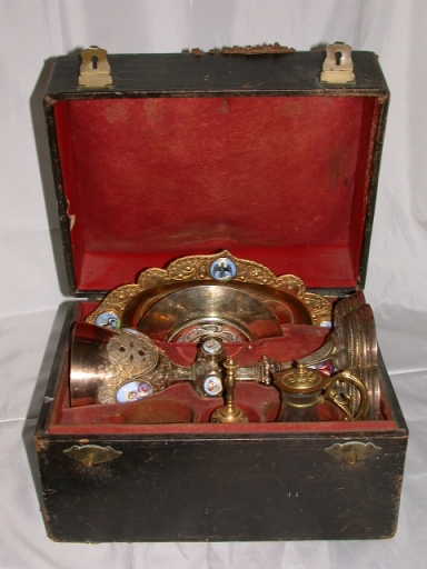 Chapelle d'orfèvrerie dans sa boîte : calice, patène, 2 burettes et leur plateau, clochette,