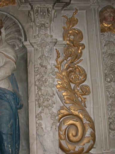 Retable, à droite de la niche centrale : chute de feuilles de chêne et voluteImmatriculation
