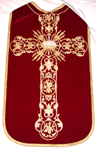 Ornement rouge 1 : chasuble, bourse de corporal, étole, manipule, voile de calice,