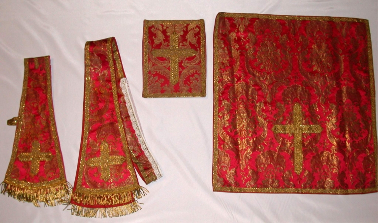 Ornement rouge 3 : chasuble, bourse de corporal, étole, manipule, voile de calice,