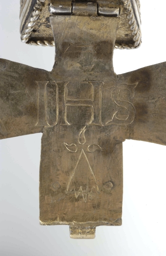 Croix-reliquaire : partie supérieure, détail revers du couvercleImmatriculation