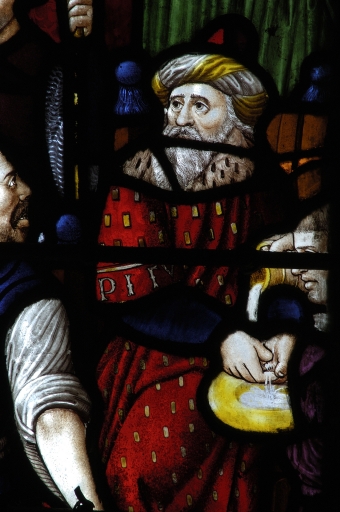 Chapelle Notre-Dame de Locmaria, baie 0, détail de Pilate se lave les mains, 2e registre.Immatriculation