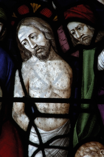 Chapelle Notre-Dame de Locmaria, baie 0, détail de la Flagellation du Christ, 2e registre.Immatriculation