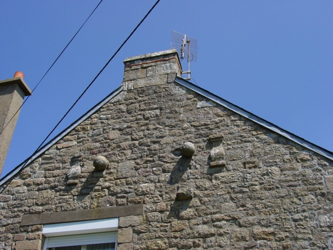 Maison ZR 235, non repérée. Pignon ouest, détail d'éléments lapidaires, balustres et boulets, en remploi, provenant d'après la tradition orale de l'ancien manoir de Kerouriec.Immatriculation