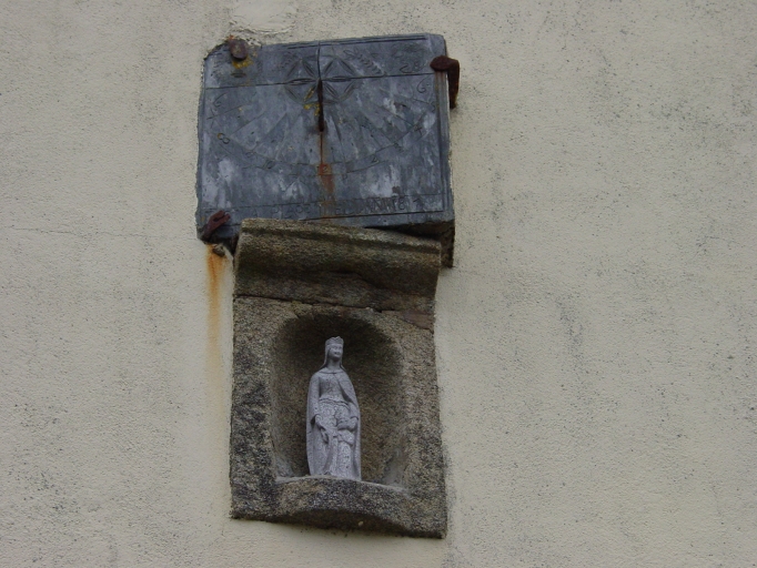 Façade sud, détail niche à Vierge et cadran solaire.Immatriculation