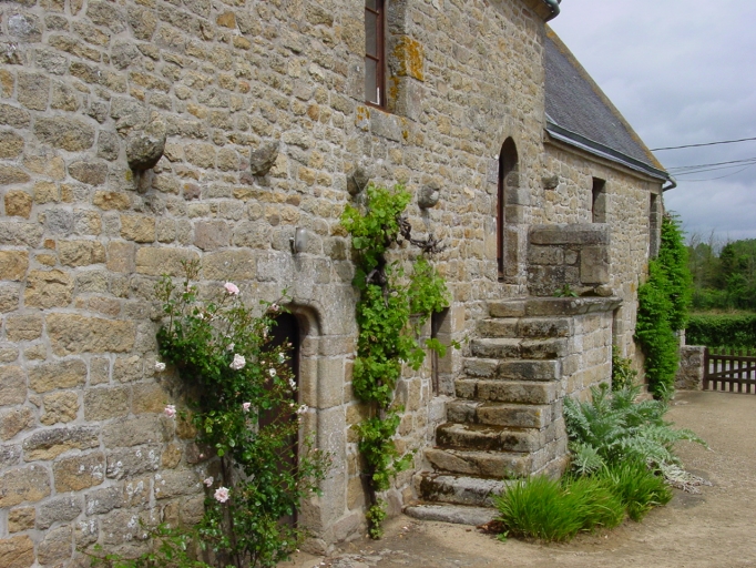 Partie ouest, façade sud, détail escalier extérieur et pierres de support de treille.Immatriculation