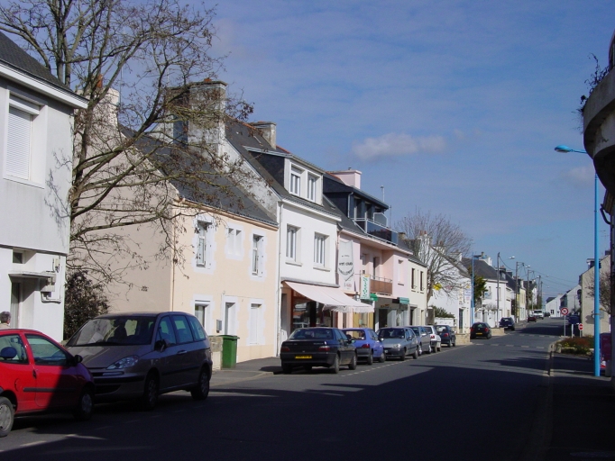 Sortie du bourg par la rue du Général Leclerc, ancien chemin aligné dans la seconde moitié du 19e siècle en direction de Belz. Vue vers le nord-est, prise au niveau du n°16.Immatriculation