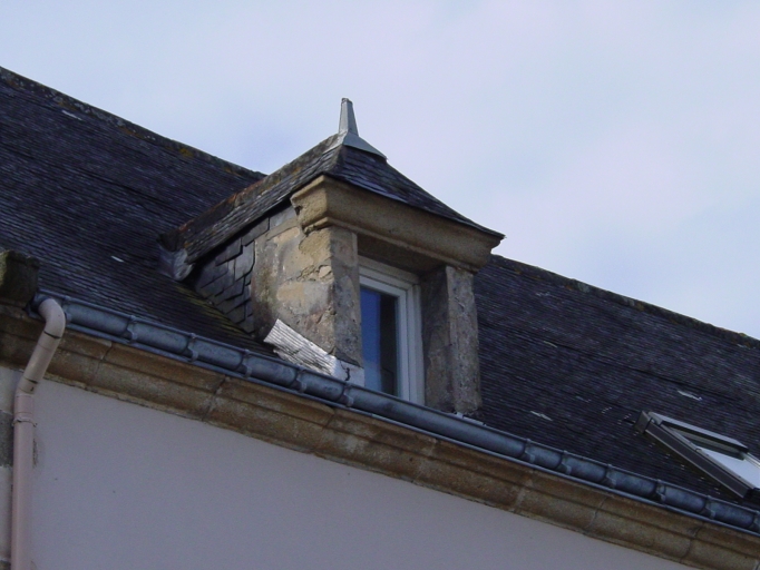 Façade antérieure, détail lucarne en pierre.Immatriculation