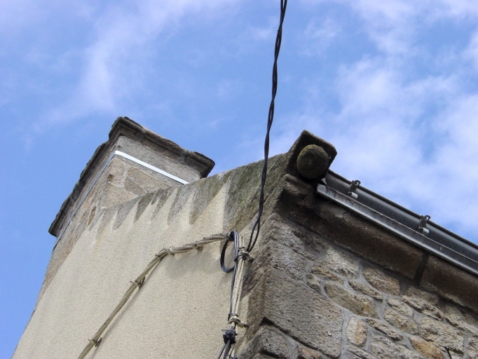 Corps occidental (AK 745). Détail souche de cheminée à corniche et départ de pignon sculpté d'un masque.Immatriculation