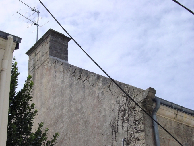 Pignon est, détail souche de cheminée et corniche.Immatriculation