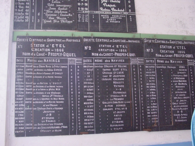 Vue intérieure : Liste des interventions du canot de sauvetage d'Etel, depuis 1866.Immatriculation
