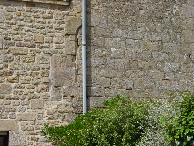 Logis principal, façade sud : détail appareil en pierre de taille et vestiges d'une porte haute double du 17e s.Immatriculation