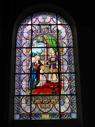 Verrières (3) baies 1, 9 et 10 (verrières historiées) : Baptême du Christ ; Présentation de Jésus au temple ; Annonciation,