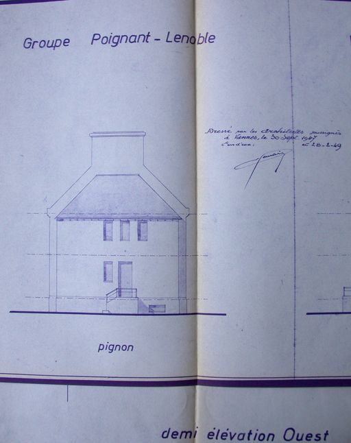 Groupe Poignant Lenoble, élévation du pignon, signée E. Gemain, 28 février 1949. Doc. OPHLM, Vannes.Immatriculation