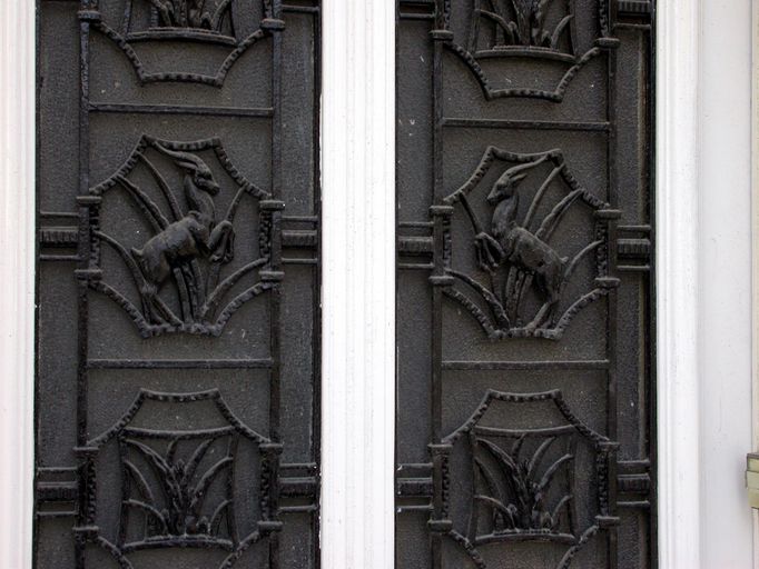 Décor de la porte d'entrée en fer forgé : antilopes et épis de blé.Immatriculation