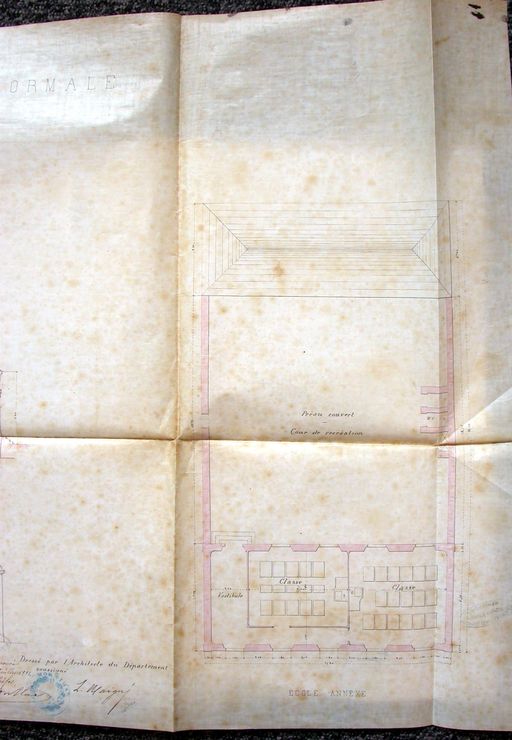 Pavillons latéraux, gymnase, logement du concierge et école d'application. Plans et élévation, signés de Maigné, datés 1881 : détail partie droite. AD Morbihan, N 757.Immatriculation