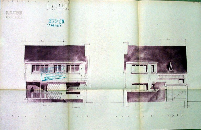 Elévation de la maison Raoul Adrien (25 bis de l'avenue) par Lamourec, 1958. AM Vannes 1G59.Immatriculation