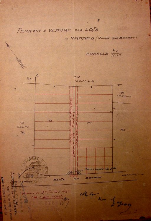 Plan du lotissement de Mme de Gazeau des Boucheries approuvé le 14 octobre 1927. AM Vannes 1G59.Immatriculation
