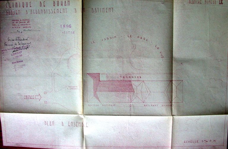 Projet d'agrandissement du bâtiment principal, par G. Caubert de Cléry, 20 février 1948. AM Vannes 1G59.Immatriculation