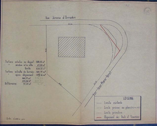 Plan d'alignement des Ponts et Chaussées, vers 1965, rue Jean-Marie Bécel et rue Jérôme d'Arradon. AM Vannes 1O 216 TAV rue Bécel.Immatriculation