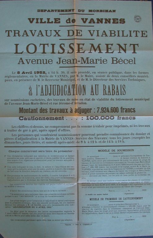 Affiche des travaux de viabilité concernant le lotissement communal de Bécel. AM Vannes 1O216 TAV rue Bécel.Immatriculation
