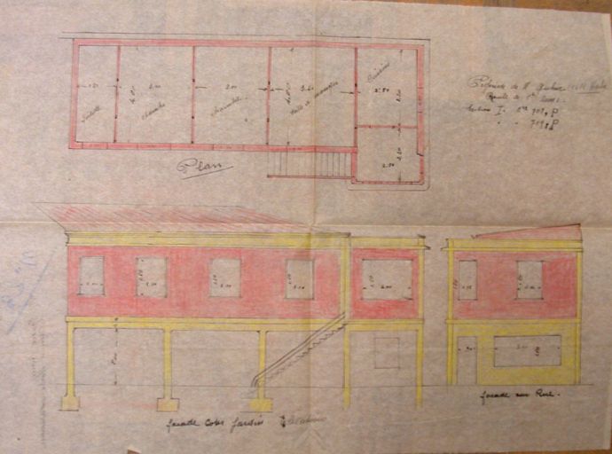 Plan et élévation est sur cour et nord sur rue, par Ronco. AM Vannes 5I 162.Immatriculation