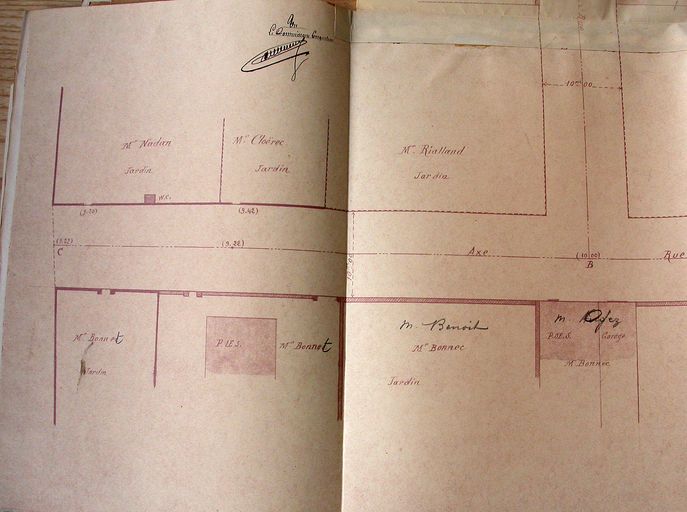 Projet de classement dans la voirie urbaine de la rue allant de la rue de Bernus à la rue d'Arradon. Plan de Thiévard, 14 octobre 1931. AD Morbihan 3O 2182.Immatriculation