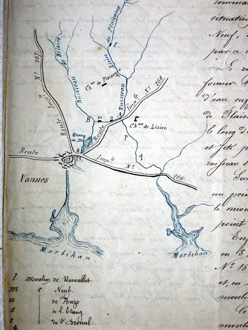 Règlement d´eau du moulin neuf sur le ruisseau de Liziec. Plan (avec figuration du moulin de Buzo), 6 juillet 1859. AD Morbihan S 1153.Immatriculation