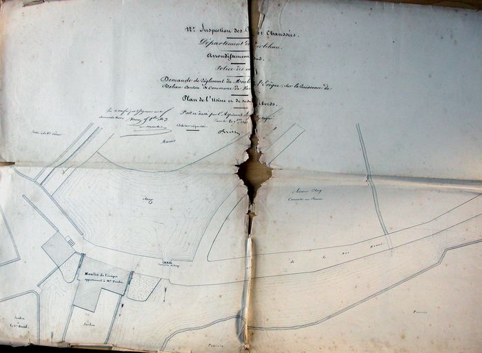 Projet de règlement d'eau du moulin de l'Evêque. Plan, 1843. AD Morbihan, S 1152.Immatriculation