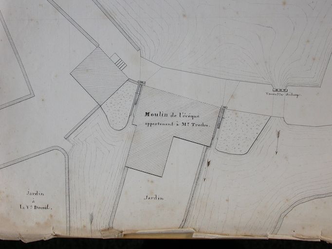 Projet de règlement d'eau du moulin de l'Evêque. Plan, détail du moulin, 1843. AD Morbihan, S 1152.Immatriculation