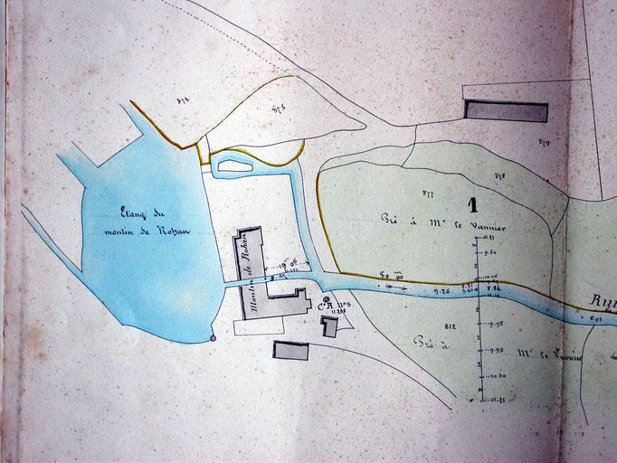Projet de règlement d'eau du moulin de l'Evêque. Partie ouest (moulin de Rohan, détail). Plan, par Fréminville, 1857. AD Morbihan, S 1152.Immatriculation