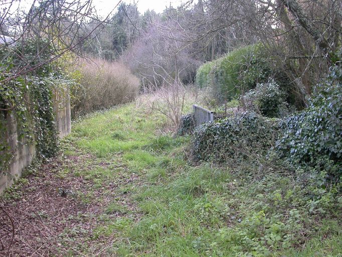 Vue générale du chemin, traversant le déversoir du moulin de Rohan.Immatriculation