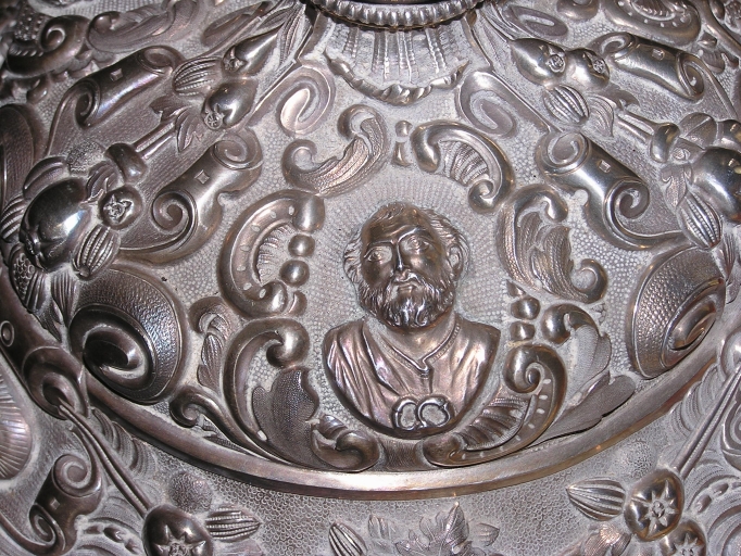 Détail du décor de la base : médaillon en repoussé figaurant saint PierreImmatriculation