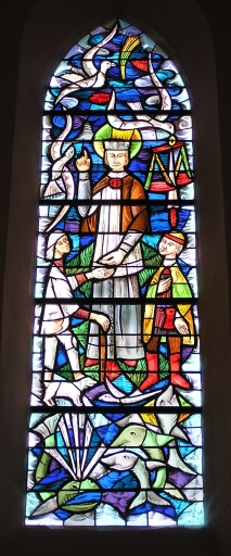 Vue générale de la verrière ouvrant sur le chœur : saint Yves. Motifs marins : poissons, baleinesImmatriculation