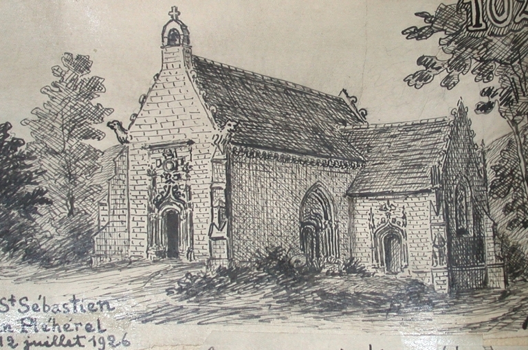 Vue générale en juillet 1926 d'après croquis du vicomte Henri Frotier de La Messelière (AD 22) : angle sud-ouest de la chapelleImmatriculation